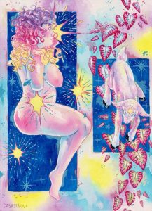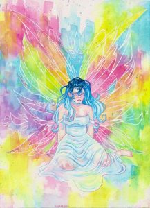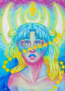 I’m an artist focusing on the natural and human form. I have always found people and our varying appearances fascinating, so that’s what I currently focus on, as well as the natural world that we live in. I take a lot of my inspiration from the natural world and my general life – the plants on the windowsill, the light on the water at the local pool, dappled light covering the park near my house, the pretty trinkets and pieces of art I’ve collected from other artists, the clouds and sky outside my window, and the flowing rivers in my town. The night sky – stars, moons and galaxies – are also a massive source of inspiration for me; there’s often celestial references in my work.