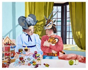 Knowing what I wish to communicate, either the image will pop into my head or I will start to think of imagery related to this, and from those I create a photo montage as a drawing reference – the medium only envisioned when a draft image can be seen. For oils it adds a depth that seems both tangible but false, whilst drawings pull you more into the details of the image while removing you from its realism.
